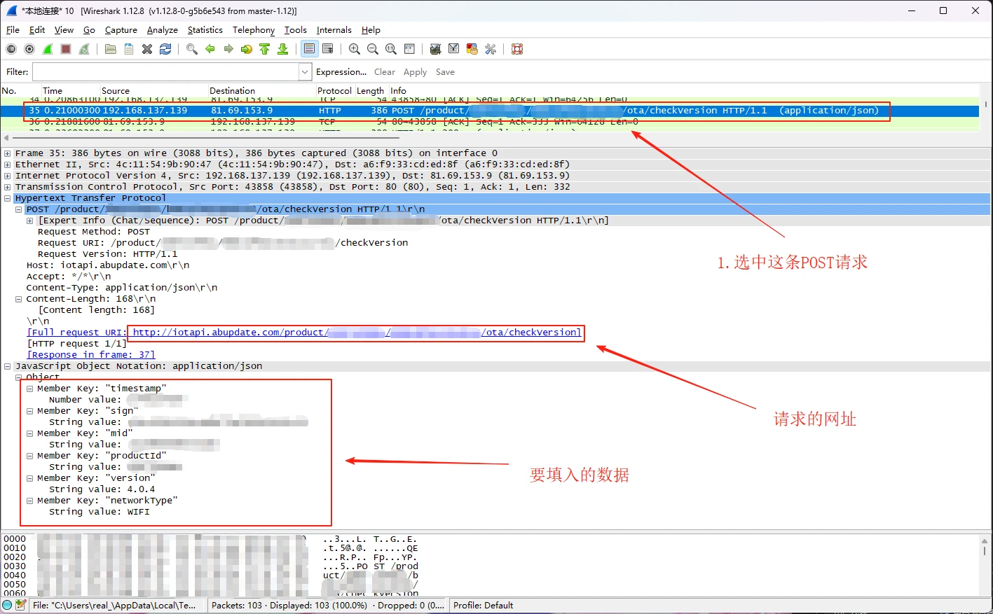使用词典笔连接电脑热点,启用wireshark对热点所在连接进行抓包,词典笔检查更新,在wireshark中找到post请求,抓到后可以停止抓包。