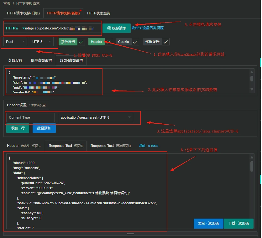 找一个HTTP测试网站,这里我用的是SOJSON,将Header设置为,将你在获得的数据填入,发送如下请求: